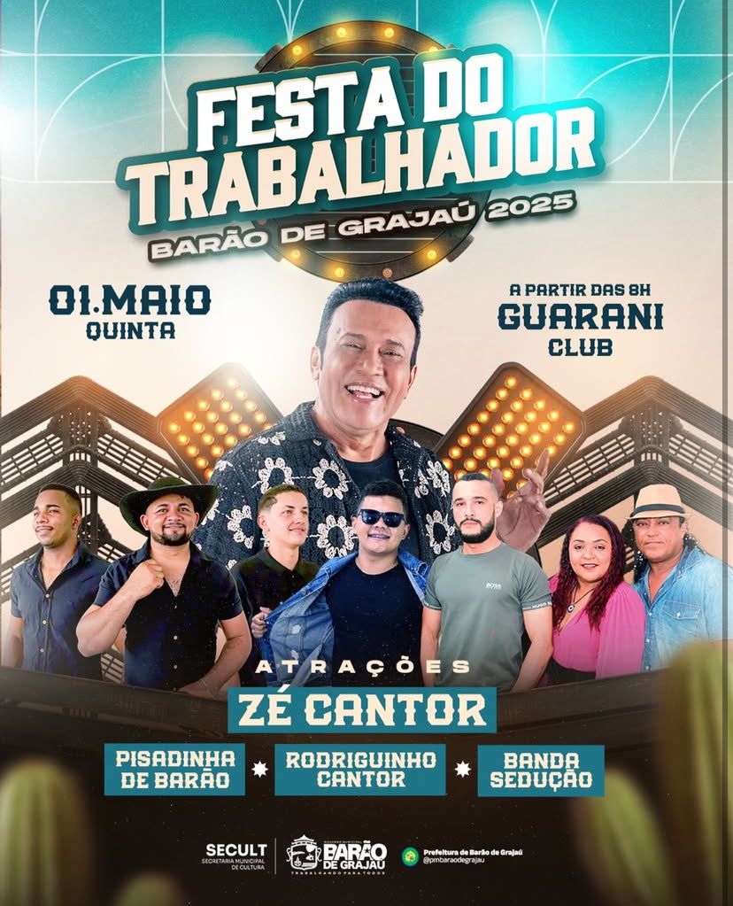 A Prefeitura de Barão de Grajaú divulgou a programação oficial da tradicional Festa do Trabalhador, que será realizada no dia 1º de maio, no Guarani Club, a partir das 8h da manhã. Este ano, o evento promete reunir muita música, alegria e gente boa, com atrações para todos os gostos. Entre os nomes confirmados estão Zé Cantor, Pisadinha de Barão, Rodriguinho Cantor e Banda Sedução.