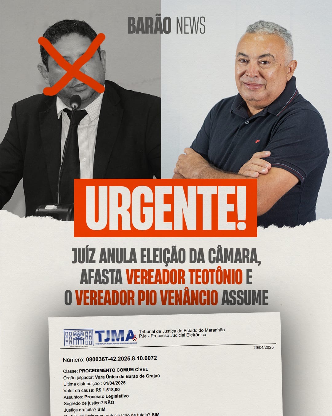 O juiz David Mourão Guimarães de Morais Meneses, da Vara Única de Barão de Grajaú, concedeu liminar anulando a eleição da nova Mesa Diretora da Câmara Municipal da cidade. A decisão atendeu ao mandado de segurança impetrado pelo vereador Gefferson Reis Cardoso, que apontou irregularidades no procedimento de votação.