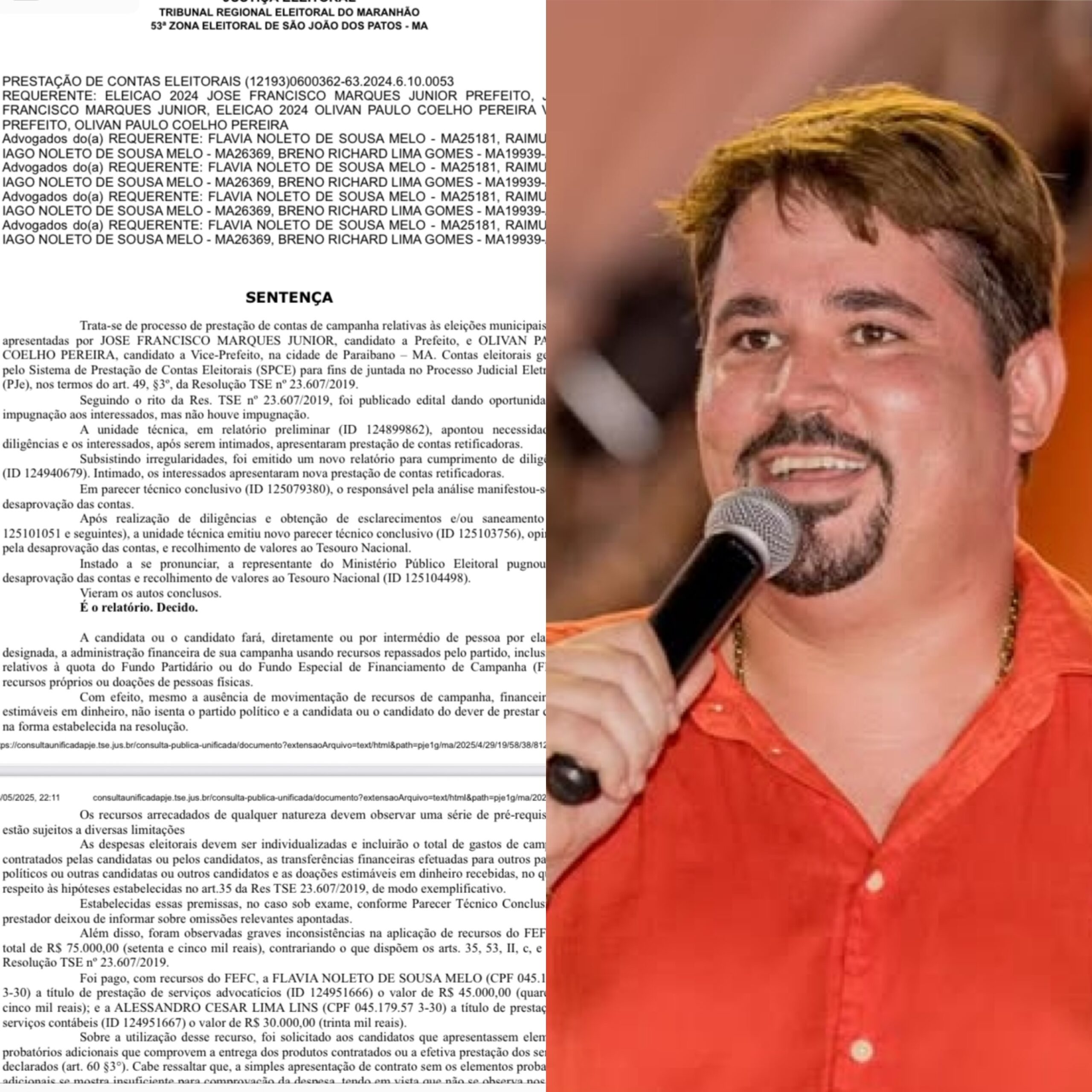 A Justiça Eleitoral da 53ª Zona Eleitoral de São João dos Patos reprovou as contas de campanha do ex-candidato a prefeito de Paraibano, José Francisco Marques Júnior, o “Júnior do Buriti”, e de seu vice, Olivan Paulo Coelho Pereira. A decisão, assinada pelo juiz Cesar Augusto Popinhak, apontou irregularidades graves no uso de recursos do Fundo Especial de Financiamento de Campanha (FEFC), especialmente a ausência de notas fiscais, contratos e comprovações de serviços efetivamente prestados.