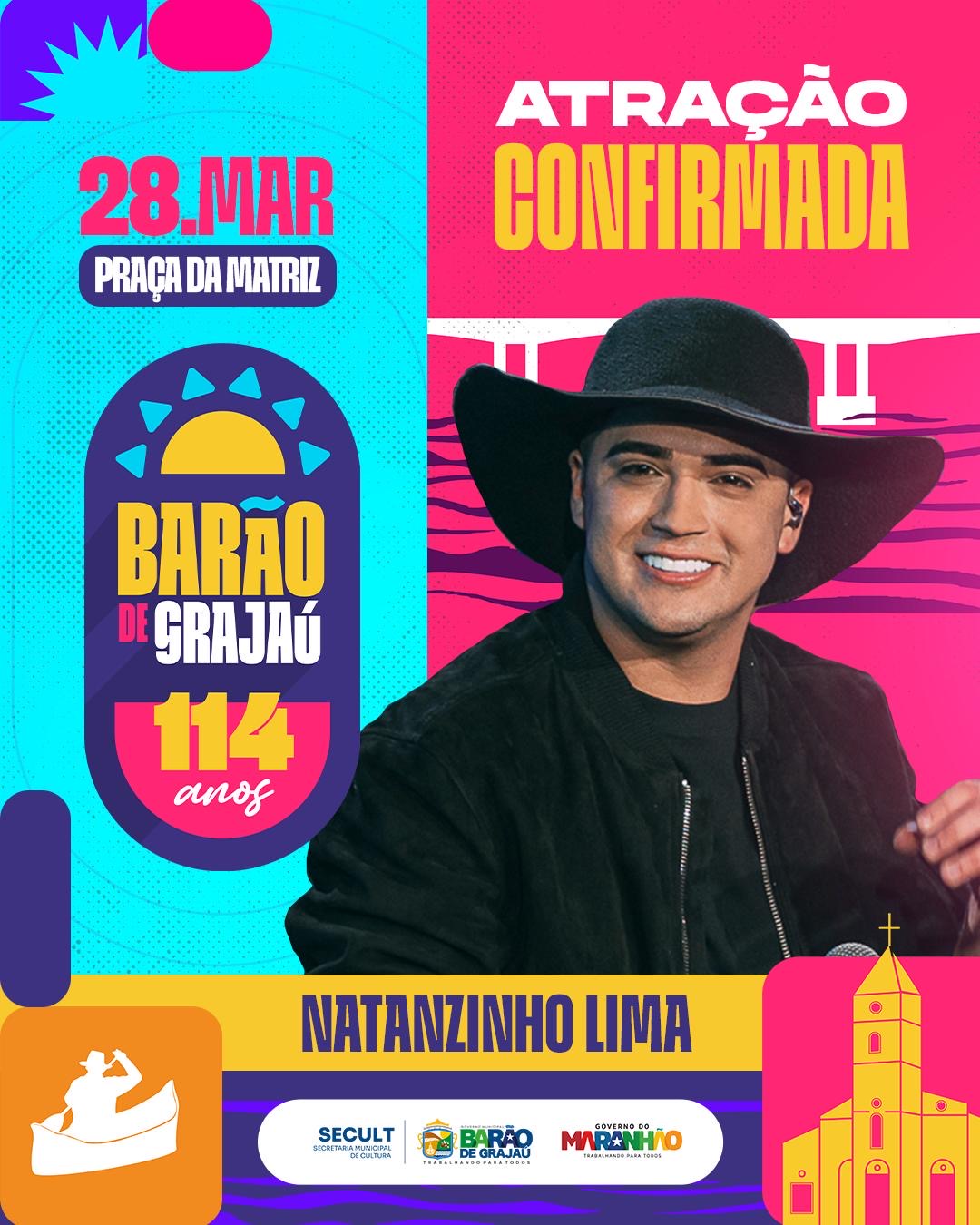 A cidade de Barão de Grajaú está em festa! Para celebrar seus 114 anos, a Prefeitura Municipal confirmou a presença do cantor Natanzinho Lima como uma das atrações principais do evento. O show acontecerá no dia 28 de março, na Praça da Matriz, e promete animar a população com muito forró e alegria. A programação faz parte das festividades organizadas pela Secretaria Municipal de Cultura (SECULT), com apoio do Governo do Maranhão, e reforça o compromisso da gestão municipal em promover cultura e entretenimento para os baronenses.