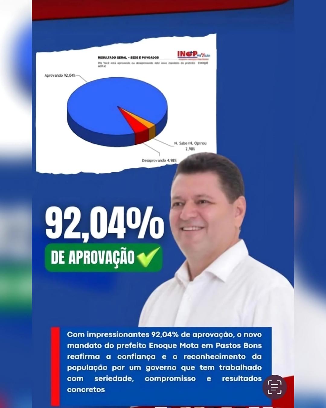 Uma pesquisa divulgada neste sábado (31) pelo Instituto INOP revelou que o prefeito de Pastos Bons, Enoque Mota (MDB), alcançou um expressivo índice de aprovação popular. De acordo com os dados, 92,04% da população da sede e povoados do município aprovam a gestão do atual chefe do Executivo, que está em seu 4º mandato à frente da Prefeitura.